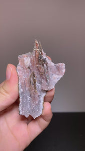 A grouping of translucent, glass like stalactites of chalcedony with what appears to be inclusions of hematite. There's also small, double terminated scalenohedral crystals of calcite present on some of the stalactites which glow a bright pink under long wave fluorescent.