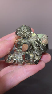 A beautiful grouping of cuboctahedron pyrite crystals from the well known Huanzala Mine in Peru. The specimen presents classic mirror luster and is in good condition.
