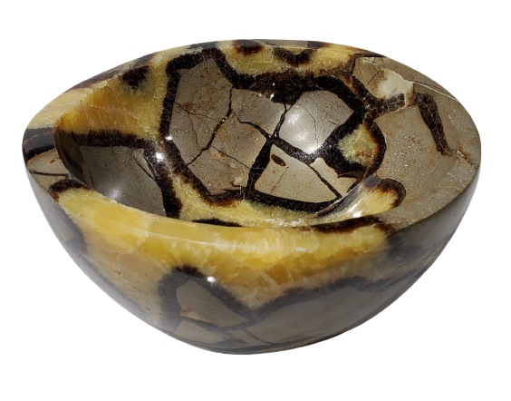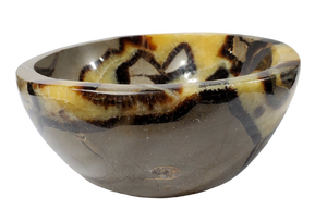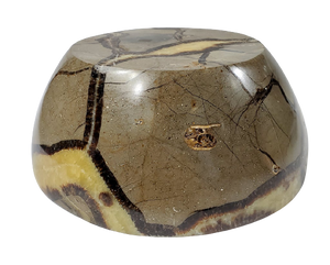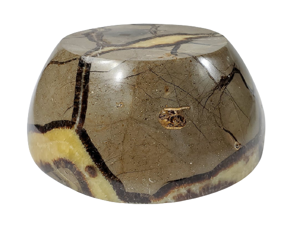 This septarian bowl from Madagascar weighs 1528 grams and measures 16 x 16 x 7 cm. It has a small ammonite fossil on one side. Septerian is a combination of aragonite, calcite, and limestone.
