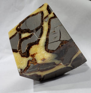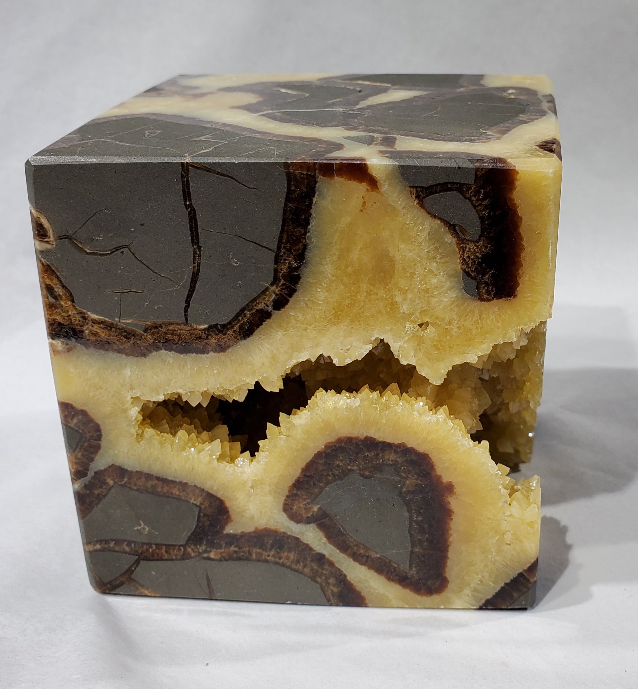 This septarian cube from Utah weighs 1078 grams and measures 7.7 x 8 x 8 cm. Septerian is a combination of aragonite, calcite, and limestone.