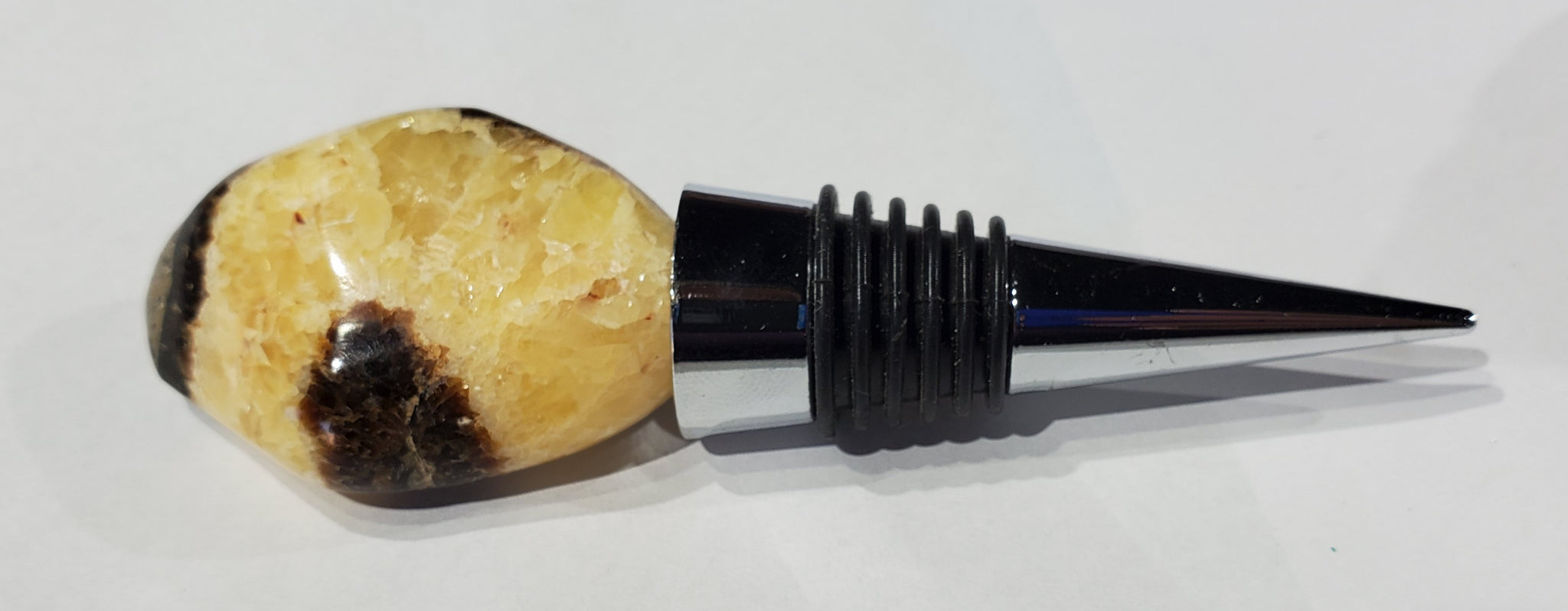 Beautiful Madagascar septerian wine stopper. Weighs 92 grams and measures 12 x 3.8 x 2.5 cm. Stone can unscrew from stopper. Septerian is a combination of yellow calcite, arragonite, and limestone.