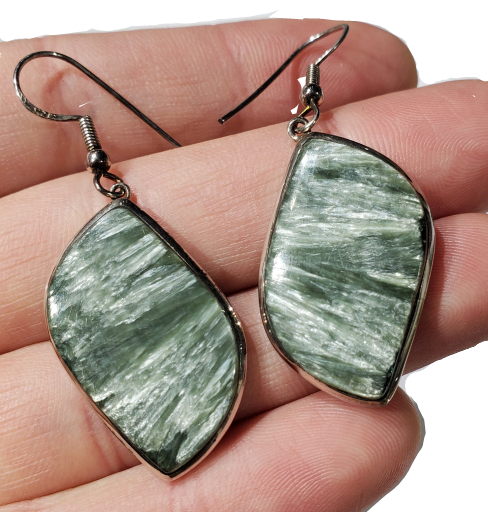 Seraphinite from Russia in sterling silver setting. Each earring measures 32 by 18 mm.